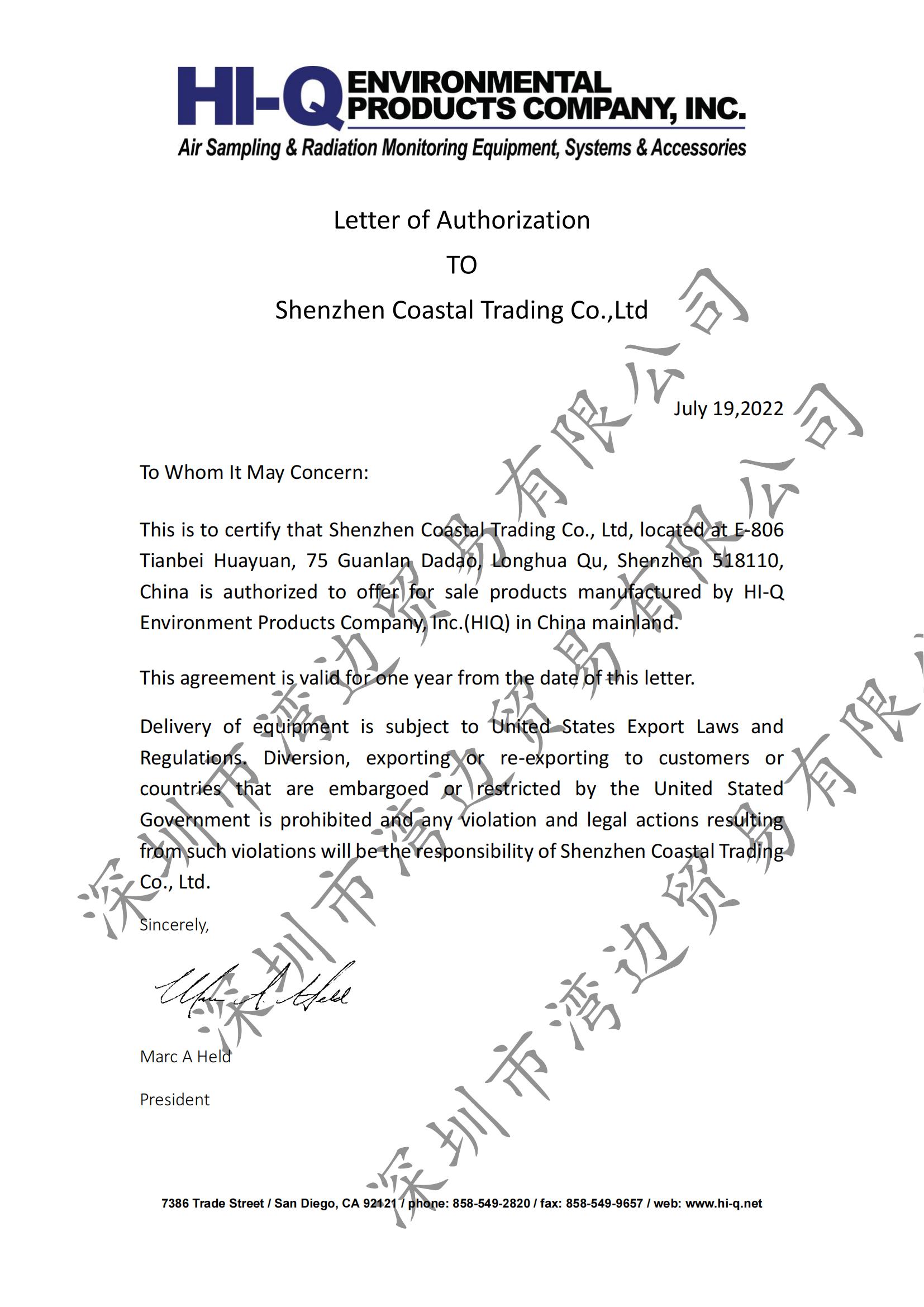 2022年7月19日美国HI-Q公司授权深圳市湾边贸易有限公司在中国境内销售HI-Q空气取样器、HI-Q过滤纸、HI-Q碘盒等产品。