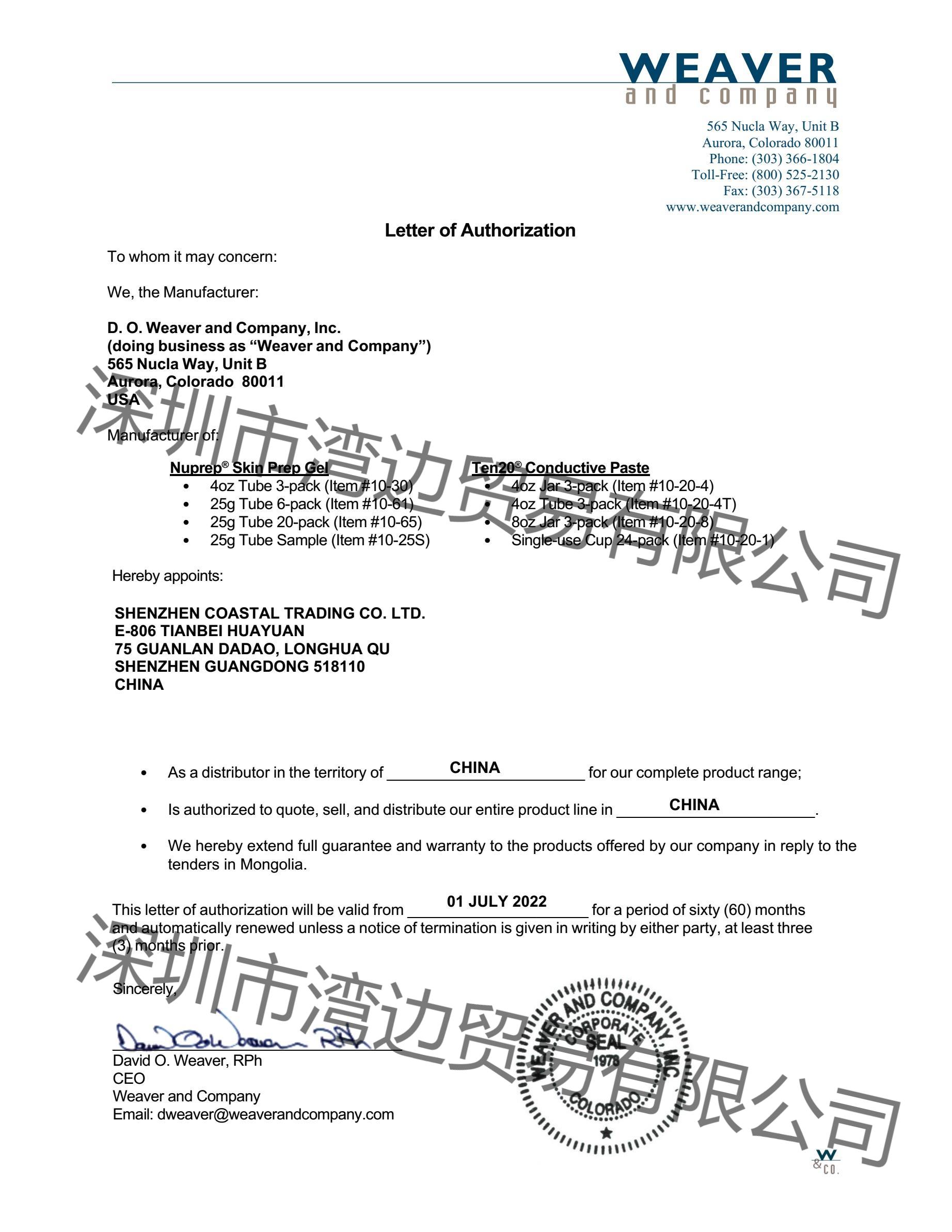 美国韦氟公司(美国WEAVER)顺延深圳市湾边贸易公司在中国区的5年销售授权。Weaver and Company 公司主要生产Ten20导电膏 型号有10-20-8 (228克装),10-20-4(114克装), Nuprep凝胶, Nuprep磨砂膏,型号10-30。